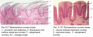 ассмотрите препарат «Язык. Листовидные сосочки» при малом увеличении и зарисуйте листовидные сосочки языка. Найдите эпителий, * сравните его с эпителием нитевидных сосочков, найдите вторичные соединительнотканные сосочки и вкусовые луковицы. Рассмотрите и зарисуйте вкусовые луковицы при большом увеличении.