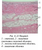 ри малом увеличении рассмотрите препарат пищевода. В его стенке найдите слизистую, подслизистую, мышечную оболочки и адвентицию. Участок стенки зарисуйте при большом увеличении, отметьте на рисунке слои слизистой оболочки: эпителий, собственный слой и мышечный (* определите какой участок пищевода представлен на срезе), наружную оболочку.