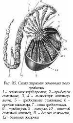 еменник снаружи покрыт плотной соединительнотканной оболочкой, от которой отходят соединительнотканные перегородки - септы, которые делят паренхиму семенника на дольки. В каждой дольке находятся один - два извитых семенных пальца.