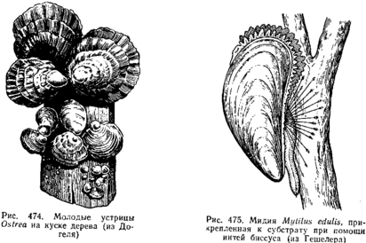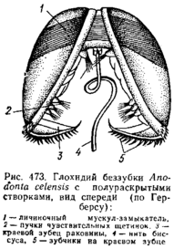 Развитие пресноводных форм (сем. Unionidae), например беззубки, обнаруживает интересные черты. Яйца откладываются в жабры (в промежуток между наружными и внутренними жаберными листками). Здесь из них развиваются двустворчатые личинки — глохидии, сильно отличающиеся от материнского организма. Створки глохидия округлой формы; на их брюшном крае имеется зубец с загнутыми острыми крючками. Замыкательных мыш ц одна, а не две, как у взрослого животного. Большинство органов еще недоразвито: дога рудиментарна, жабр нет. У личинки посреди брюшной поверхности туловища выдается длинная липкая нить биссуса, торчащая из отверстия биссусовой железы. Когда мимо моллюска, содержащего глохидии, проплывает рыба, моллюск выталкивает через выводной сифон личинок в окружающую воду. При помощи биссусовой нити и шиповатых створок глохидии прикрепляются к жабрам или плавникам рыбы. Вокруг вызванной глохидиями маленькой ранки раздражаемый эпителий рыбы разрастается и постепенно покрывает личинку. Внутри получившейся опухоли глохидий питается за счет хозяина, увеличивается в размерах и в течение нескольких недель проходит дальнейшее развитие. Он постепенно превращается в миниатюрного моллюска, опухоль лопается, и молодая ракушка вываливается из нее и падает на дно. Итак, развитие Unionidae связано с временным паразитизмом, выгодным и в смысле питания, и в смысле расселения медлительных ракушек на далекие расстояния.