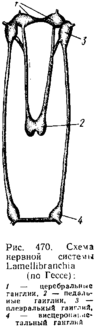 Нервная система состоит из 3 пар ганглиев. Цереброплевральные ганглии представляют продукт слияния двух пар узлов; это доказывается тем, что у примитивных Protobranchia плевральные узлы еще несколько обособлены от церебральных. Цереброплевральные узлы соединяются над глоткой тонкой церебральной комиссурой. В ноге залегает пара педальных ганглиев, которые соединяются с церебро-плевральными посредством двух длинных коннекти-вов. Еще более длинные коннективы идут от цереброплевральных узлов к паре висцеропариетальных ганглиев, лежащих под задним мускулом-замыкателем. Эти ганглии кроме внутренностей иннервируют осфрадии и жабры.