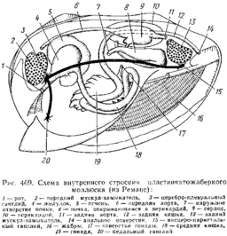 Наружный тонкий слой раковины, или периостракум, состоит из органического вещества, конхиолина, и нередко стирается на выпуклых частях створки (у макушки). Под ним залегает призматический, или фарфоровидный, слой, слагающийся из тесно прилегающих друг к другу призмочек углекислой извести, поставленных перпендикулярно поверхности раковины. Этот слой обладает значительной толщиной. Самый внутренний слой, перламутровый, образуется тончайшими, лежащими в несколько слоев известковыми листочками, между которыми залегают столь же тонкие прослойки конхиолина. В перламутре имеет место интерференция световых лучей; вследствие этого перламутр блестит и переливает разными цветами. Перламутровый слой подстилается эпителием мантии, который и выделяет раковину. Этот же эпителий у некоторых Lamellibranchia формирует жемчуг. Если какие-нибудь очень мелкие частицы, например омертвевшие клетки или зернистые продукты выделения, или тельца постороннего происхождения, например песчинки, нередко паразиты, попадут в промежуток между раковиной и эпителием мантии, то они все больше и больше обволакиваются концентрическими слоями перламутра и превращаются в жемчужины.