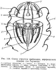 Рот ведет в эктодермальную глотку, имеющую вид сильно сплющенной в одном направлении трубки; кверху глотка переходите энтодермаль-ный желудок — мешок, сплющенный в направлении, перпендикулярном к плоскости сплющивания глотки. Плоскость, по которой сплющена глотка, называется глоточной, а та, в которой происходит сплющивание желудка, — щупальцевой, так как в ней же лежит пара щупалец; эти плоскости и являются плоскостями симметрии. От желудка отходят каналы гастроваскулярной системы. Один канал направлен к полюсу, противоположному рту, и непосредственно под аборальным полюсом распадается на 4 короткие ветви: две слепые и две, заканчивающиеся узкими отверстиями. Другие два канала отходят от желудка в щупальцевой плоскости и в направлении, перпендикулярном главной оси тела, — это каналы первого порядка; каждый из них на пути к краю тела дважды дихотомически ветвится, давая 2 канала второго и потом 4 канала третьего порядка. Получившиеся таким образом 8 каналов третьего порядка впадают в соответственное число меридиональных каналов, идущих параллельно поверхности тела от аборального полюса к оральному; оба конца меридиональных каналов замкнуты слепо. От желудка отходят еще два канала, идущие к оральному полюсу по сторонам глотки. Соответственно меридианальным каналам на поверхности тела проходят 8 ребер, или валиков, на которых сидят главные органы движения гребневиков – гребные пластинки.