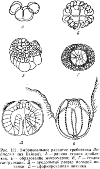 Жизненный цикл гребневиков простой, без метаморфоза. Дробление полное, но не равномерное, один полюс зародыша состоит из быстро дробящихся мелких микромеров, другой — из медленно делящихся макромеров. Микромеры дают эктодерму, макромеры — энтодерму. Микромеры обрастают книзу массу макромеров, которая к тому времени обнаруживает на нижнем полюсе впячивание — первичный рот и зачаток гастральной полости. Получается гаструла. По краям бластопора эктодерма впячивается и образует глотку. В глубине гастральной полости часть клеток энтодермы уходит в промежуток между эктодермой и энтодермой (т. е. в остаток полости бластулы) и дает там крестообразную группу клеток. Из этих клеток впоследствии формируются клеточные элементы мезоглеи и мускульные оси щупалец. Интересно, что здесь мы впервые видим во время развития обособленные зачатки специального третьего клеточного зародышевого пласта — мезодермы. Этим слабым зачатком является вышеупомянутая крестообразная клеточная пластинка.