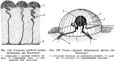 Таким образом, гребневики в течение всей жизни движутся при помощи измененных ресничек, тогда как у кишечнополостных этот способ движения имеется лишь у личинок, во взрослом же состоянии заменяется мускульным движением.