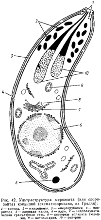 Тело кокцидий снаружи покрыто трёхмембранной пелликулой. Под ней расположен слой субпелликулярных микротрубочек. Вместе с пелликулой он выполняет каркасную функцию. Наружная мембрана мерозоита непрерывна, 2 внутренние прерываются на переднем и заднем концах, где располагаются опорные кольца. В отверстии каждого кольца располагается конусообразная полая прочная структура – коноид. Его стенку формируют спирально закрученные фибриллы. Коноид несёт опорную функцию. В передней трети расположены мешковидные, сужающиеся к внешнему концу роптрии (их 2 – 14). Их дистальные концы проходят сквозь кольцо коноида. Также в переднем конце лежат 10-12 мионем, секрет которых, возможно, через роптрии выделяются наружу. Также у всех стадий, кроме микрогамет, есть микропоры, представляющие собой микроцитостомы. В клетках также есть митохондрии и аппарат Гольджи.