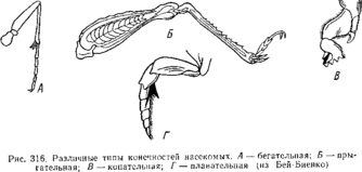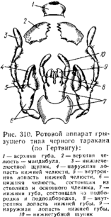 По-видимому, первичным для насекомых было питание более или менее твердым органическим детритом растительного или животного происхождения, что определило появление хищничества или настоящей растительноядности. Но во всех этих случаях животному необходимо захватывать и разгрызать пищевой объект. Поглощение жидкой пищи обусловило появление принципиально иных приспособлений. Этим условиям полностью отвечают встречающиеся у прямокрылых, тараканов, жуков и т. п. ротовые аппараты грызущего типа. Их первичный характер доказывается наиболее богатой расчлененностью отдельных конечностей, сходством с ротовыми органами многоножек и тем, что они встречаются у личинок многих отрядов насекомых (например, чешуекрылых) , у которых во взрослом состоянии ротовые аппараты других типов.