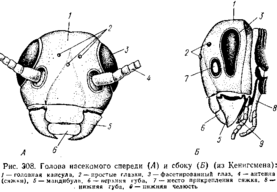 Голова одета общей хитиновой капсулой, резкий пережим, или шейка, отделяет ее от груди, с которой она большей частью соединена подвижно. На нижней поверхности головы или на ее переднем конце помещается рот. По бокам головы расположены два больших сложных глаза, между которыми могут находиться несколько мелких одиночных глазков.