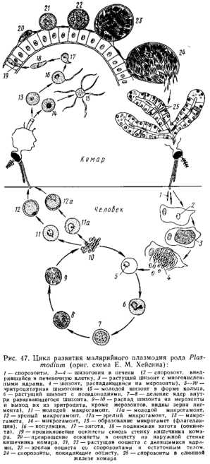 Часть жизненного цикла гемоспоридий протекает в эритроцитах позвоночных, а спорогония – в теле кровососущих насекомых (чаще комаров). Возбудители малярии.