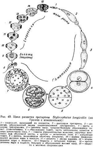 Грегарины – внеклеточные паразиты (кишечник, полость тела, реже – половые железы) паразиты беспозвоночных, в основном членистоногих. Передний конец тела большинства грегарин образует органоид прикрепления к стенкам кишечника – эпимерит. Снаружи тело одето пелликулой, образующей продольные гребни. Под пелликулой залегает эктоплазма, которая примерно на 1/3 длины тела образует волокнистую перегородку. Перегородка отделяет протомерит – часть, не несущую ядра – от дейтомерита. У видов со сферической формой тела периферическая часть эктодермы состоит из студенистого слоя, пол которым у многих расположена система кольцевых или продольных волоконец– мионем, имеющих сократительный характер. Полужидкая эндоплазма богата гликогеном, что связано с анаэробным обменом веществ. Ротовое отверстие и порошица отсутствуют, нет сократительной вакуоли. Питание и дыхание всей поверхностью тела. Движение при помощи мионем и скольжения.