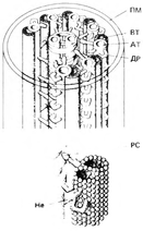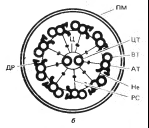 Кинетосома (базальное тело) – внутриклеточная часть жгутика. В кинетосоме структура аксонемы меняется. Центральные микротрубочки заканчиваются в аксиальном зерне, а периферические дублеты становятся триплетами в результате добавления к нему С-трубочки, которая, как и В-трубочка, неполная и имеет 3 общих протофиламента с последней.