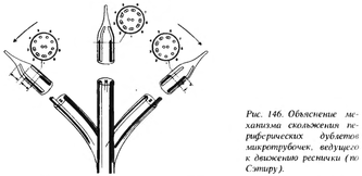 Д) При недостатке АТФ динеиновая ручка возвращается в горизонтальное положение; при этом дублеты смещаются относительно друг друга.