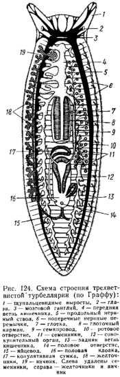 Triclada – трехветвистый кишечник, складчатая выдвижная глотка.