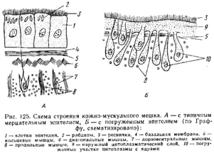 Покров – однослойный мерцательный эпителий, который может быть преобразован в погружённый эпителий (в этом случае он лишён ядер и представляет собой неразделённую цитоплазматическую пластинку с ресничками по свобожному краю). С покровами связаны многочисленный кожные железы. Одна из их разновидностей – рабдиты, которые, разбухая в воде, образуют на поверхности тела червя сгустки слизи.