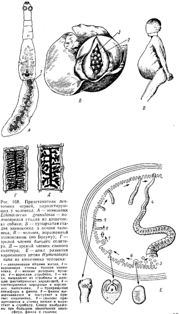 Наиболее опасен для человека цепень эхинококк. Вид этот прямо противоположен предыдущим по относит ельной величине ленточной и пузырчатой стадий. Тогда как половозрелая форма состоит всего из 3—4 члеников и достигает 5 мм длины, финны червя образуют пузырь, достигающий размеров яблока, а иногда детской головы. Сам цепень живет в тонкой кишке собаки, лисицы и волка, а стадию финны проходит в различных органах (особенно в печени и легких) крупного рогатого скота, овец, свиней, реже лошадей, кроликов, а также и человека. У скота заражение происходит при поедании вместе с травой яиц Echinococcus, попавших на траву из экскрементов пастушьих собак. Человек заражается при неосторожном обращении с собаками. Яйца Echinococcus так малы (35 мкм длины), что легко могут попасть в рот, если не мыть руки перед едой после того, как гладили зараженную собаку, и т. п. То же самое может случиться, если позволить собаке лизать себе руки или лицо и т. п. Собаки же заражаются финнами эхинококка, поедая внутренности зараженного рогатого скота и свиней.