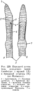 Тело олигохет сильно вытянуто, более или менее цилиндрическое. Мелкие формы малощетинковых едва достигают 0,5 мм, наиболее крупный представитель — земляной червь (Megascoli-des australls) длиной до 3 м. На переднем конце находится небольшая подвижная головная лопасть (простомиум), лишенная глаз, антенн и пальп (рис. 229). Сегменты туловища внешне одинаковы, число их обычно велико (от 30—40 до 600), в редких случаях сегментов мало (7—9). Каждый сегмент, кроме самого переднего, несущего ротовое отверстие, снабжен маленькими щетинками, торчащими непосредственно из стенки тела. Это последние остатки исчезнувших параподий, обычно расположенные четырьмя пучками — парой боковых и парой брюшных. Число щетинок в пучке варьирует. На конце тела находится небольшая анальная лопасть (пигидиум) с порошицей.