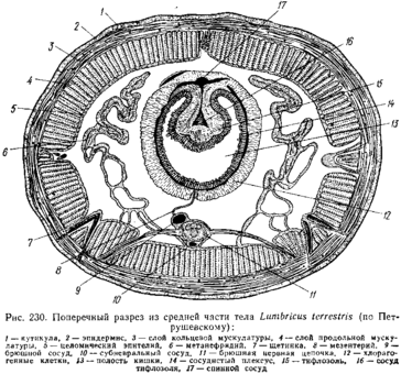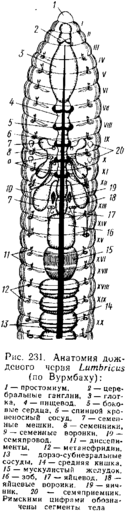 Пищеварительная система состоит из ряда хорошо дифференцированных отделов — глотки, пищевода (иногда также зоба) и мускульного желудка, средней и задней кишки (рис. 231). У дождевых червей в пищевод впадают три пары особых известковых желез. Они густо пронизаны кровеносными сосудами и служат для удаления карбонатов, накапливающихся в крови. Излишки извести поступают из желез в пищевод и служат для нейтрализации гуминовых кислот, содержащихся в поедаемых червями гниющих листьях. Спинная стенка средней кишки образует продольное желобовидное впячивание внутрь просвета кишечника, или тифлозоль; развитие тифлозоля увеличивает всасывательную поверхность кишки (см. рис. 230).