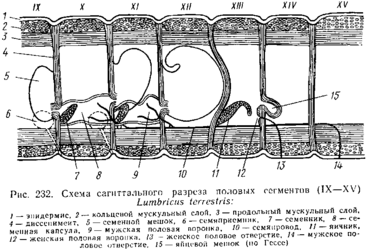 Половая система олигохет гермафродитна, гонады локализованы в небольшом числе половых сегментов. Расположение гонад может сильно варьировать, мы ограничимся описанием их у дождевого червя. В 10-м и 11-м сегментах тела червя залегают 2 пары семенников, лежащих в семенных капсулах, семенники прикрыты тремя парами особых семенных мешков, последние развиваются как выпячивания диссепиментов. В семенные мешки половые клетки попадают из семенных капсул, после того как они отделились от семенников. В семенных мешках живчики созревают, и зрелые спермин поступают обратно в семенные капсулы. Для вывода живчиков служат специальные протоки. В семенной капсуле имеется по паре мерцательных воронок, от каждой из них отходит назад выводной канал. Оба канала каждой стороны сливаются в один продольный семяпровод, открывающийся на брюшной стороне 15-го сегмента. Половые воронки вместе с выводными протоками представляют настоящие целомодукты, т. е. образования ме-зодермальной природы.