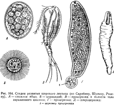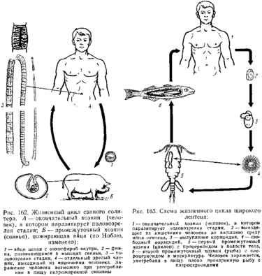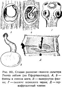 Наиболее прост способ диагноза вышеприведенных человеческих bhi дов ценней по форме матки и выходящих наружу зрелых члеников. Верно поставить диагноз в данном случае важно, так как Т. solium значительно опаснее остальных видов. Вооруженный цепень может встречаться в человеке не только в виде ленточной глисты, но и в стадии финны, т. е. человек может служить для него и промежуточным хозяином. Следовательно, достаточно яйцам Т. solium попасть каким-либо образом в желудок человека, чтобы там из них вышли онкосферы, дающие в конечном счете финну. Между тем финны часто оказываются в печени, иногда в мозге, в глазу и своим присутствием могут причинять тяжелые заболевания или даже смерть. Обыкновенно заражаются при неопр ятности, например яйцами, приставшими к белью, рукам и т. п. Но у лиц, страдающих кишечной формой Т. solium, может быть и другой способ массового самозаражения, а именно: при рвоте происходит антиперистальтическое сокращение кишок, вследствие чего куски стробилы могут попасть из тонкой кишки в желудок. Здесь из зрелых яиц, находящихся в члениках, выходят зародыши, пробуравливающие слизистую оболочку кишки и превращающиеся в финны. Поэтому к заболеванию кишечной стадией Т. solium следует относиться серьезно, рекомендуя больному как можно скорее произвести изгнание паразита и притом непременно под наблюдением врача, ибо глистогонные средства в некоторых случаях вызывают отравление и рвоту.