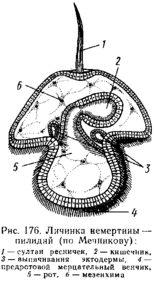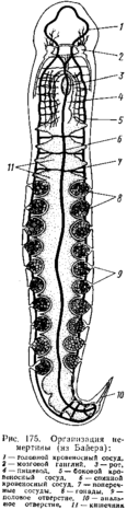1. Полость тела у немертин отсутствует, и промежутки между органами заполнены паренхимой. Пищеварительная система устроена сло жнее, чем у плоских червей, и слагается из передней, средней и задней кишки; последняя открывается на конце тела анальным отверстием. У немертин впервые появляется хорошо развитая кровеносная система. Специальных органов дыхания нет. Для выделения служат протонефридии. Нервная система устроена по типу ортогона.
