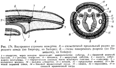 Строение и физиология. Тело обычно вытянуто в длину, способно к сокращению и иногда сплющено в спинно-брюшном направлении; чаще оно более цилиндрическое (рис. 173.Л). Размеры немсртин варьируют от 1—2 см до 2 м, а в исключительном случае даже до 30 м (Lineus longissimus). Большинство Nemertini окрашено в темные тона, но имеются виды, характеризующиеся зеленой, ярко-красной, розовой или пестрой окраской.