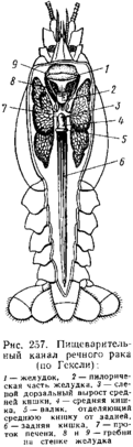 Строение и физиология. Сегментация ракообразных характеризуется наибольшим среди прочих членистоногих разнообразием. Как правило, у них выделяются три отдела тела — голова, грудь и брюшко. Однако у некоторых самых примитивных форм гомономность сегментов бывает столь выражена, что грудь и брюшко почти не отличимы друг от друга (см. рис. 280, 281). Подобные исключения, правда, немногочисленны, и у большинства раков эти два отдела хорошо дифференцированы. Количество сегментов, входящих в состав тела ракообразных, подвержено сильным вариациям: от 5—8 до 50. В процессе эволюции ракообразных, как и других групп членистоногих, происходило уменьшение числа сегментов. Об этом говорит более богатое расчленение примитивных видов по сравнению со специализированными.
