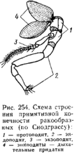 На следующих за акроном сегментах располагаются уже настоящие конечности, гомологичные параподиям кольчецов. Из всех членистоногих у раков сохраняется наиболее примитивный тип строения ножек, которые во многих случаях двуветвистые, чем они напоминают параподии полихет. Такая конечность состоит из расчлененного основания—протоподита, от конца которого отходят 2 ветви: внутренняя, более близкая к медианной линии тела — эндоподит, и наружная — экзоподит. Кроме того, протоподит несет особые выросты — эпиподиты, выполняющие функцию органов дыхания — жабр.