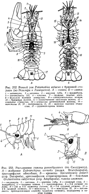 У более примитивных форм сегменты каждого отдела тела остаются свободными и явственно отграничены друг от друга; у других же они сливаются воедино. При этом часть сегментов одного отдела может присоединяться к соседнему. В этом отношении большое разнообразие наблюдается в строении головы раков. Довольно часто сохраняется еще очень древнее расчленение головного отдела — самый передний его участок, состоящий из слившихся акрона и первого антеннального сегмента, он резко отделен от остальных сегментов. Этот участок, называемый первичной головой, или протоцефалоном, несет глаза и обе пары антенн.