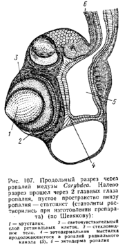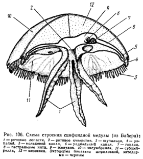Тело в виде круглого зонтика или высокого колокола. Посреди нижней вогнутой сроны на конце ротового стебелька – четырёхугольный рот. Углы рта вытягиваются в 4 ротовые лопасти – желобовидные выросты, служащие для захвата пищи. У корнеротых сцифомедуз ротовые лопасти становятся складчатыми и срастаются, так что от ротового отверстия остаются лишь многочисленные поры. Рот ведёт в энтодермальный желудок, занимающий центр зонтика и образующий 4 неглубоких карманообразных впячивания. В желудок вдаются с краёв 4 валика с гастральными нитями, которые служат для увеличения всасывающей поверхности энтодермы. От желудка расходится к краям тела система радиальных каналов. В простейшем случае их 4, у других видов – 8, у ряда сцифомедуз гастроваскулярная система состоит из 4 сильно ветвящихся каналов I порядка, 4 ветвистых каналов II порядка и 8 неразветвлённых каналов III порядка. Каналы чередуются в расположении, а своими наружными концами впадают в кольцевой канал, окаймляющий край зонтика. Край зонтика несёт различное количество щупалец. Некоторые из щупалец, расположенные у концов главных каналов I и II порядков, видоизменяются и превращаются в краевые тельца, или ропалии. При этом щупальца укорачиваются и утолщаются, а внутри них развиваются органы зрения и равновесия. Каждый ропалий чаще содержит 1 статоцист и несколько глазков различной степени сложности строения; наряду с глазками, напоминающими таковые гидроидных медуз, есть и более сложные глаза типа глазного пузыря. Такой глаз получается посредством погружения глазной ямки пол эпителий и отшнуровывания её от поверхности тела, причём ямка замыкается под кожей в глазной пузырь. Кожный эпителий над пузырём остаётся тонким и прозрачным и называется роговицей. Дно и боковые стенки пузыря состоят из пигментных и чувствительных клеток, как и у гидромедуз. Часть стенки пузыря, лежащая непосредственно под роговицей., сильно утолщается и образует двояковыпуклый хрусталик. Внутренность пузыря заполнена бесструктурным стекловидным телом, которое выделяется стенками пузыря. Возможно, такие глаза служат только для различения света и тьмы. В связи с сильным развитием органов чувств нервная система сцифомедуз также усложняется. На протяжении краевого нервного кольца соответственно 8 ропалиям возникает 8 ганглиев.