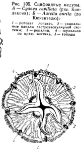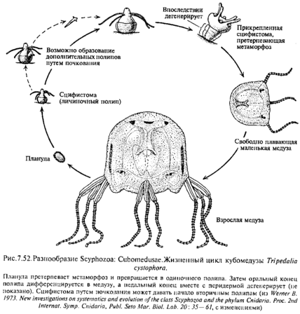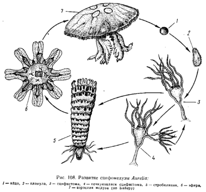 Медузы раздельнополы. Половые железы образуются из энтодермы нижней поверхности карманов желудка. Созревшие половые клетки выводятся наружу через рот. После полного и равномерного дробления яйцаобразуется бластула, а затем типичная мерцательная планула. Она сначала плавает, а затем прикрепляется передним полюсом к морскому дну. На верхнем полюсе прорывается рот,который ведёт к образующейся к этому времени гастральной полости. Вокруг рта образуется венчик щупалец, число которых кратно 4. Эндотерма гастральной полости даёт 4 продольных желудочных валика. В результате этих изменений образуется маленький одиночный полип – сцифистома, который может путём почкования дать начало другим сцифистомам. Главный процесс, связанный со сцифистомой – стробиляция: поли делится путём ряда поперечных перетяжек, которые постепенно врезаются с краёв в тело полипа. На этой стадии полип называется страбилой. Образовавшиеся в процессе стробиляции диски представляют собой молодых медуз, расположенных вогнутыми сторонами их зонтиков кверху. Медузы постепенно отделяются из стробилы. На этой стадии они называются эфирами. Край зонтика эфиры глубоко вырезан в виде 8 лопастей. Превращение во взрослую медузу сопровождается усиленным ростом и состоит главным образом в том, что края зонтика выравниваются, формируется сложная канальная система, появляются краевые щупальца и зачатки гонад. Так, сцифомедузы обладают метагенез ом с преобладанием медузоидного поколения.