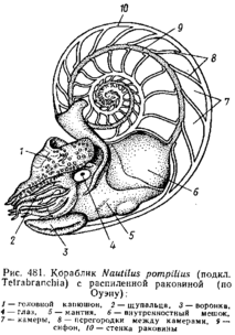 У других представителей класса Cephalopoda, еще сохранивших раковину, она в виде известковой пластинки сложного строения, залегающей под покровами на спинной стороне туловища. Такова, например, раковина каракатицы Sepia. Спинная сторона такой раковины прикрыта тонким роговым листком (проостракум), а задний конец образует очень маленький конус, заканчивающийся известковым рожком (рострумом). Главную массу раковинной пластинки составляет множество плотных известковых пластиночек, отходящих от проостракума косо книзу (к брюшной стороне тела). Промежутки между пластиночками очень узки и заняты рыхлой известковой массой.