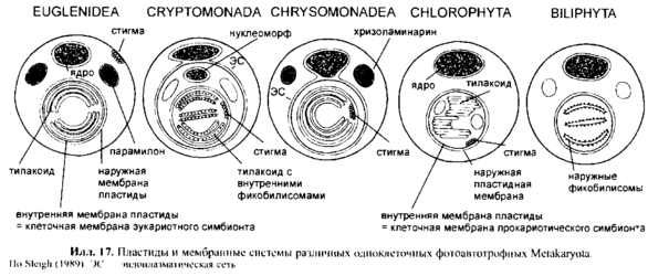У эвгленид и динофлагеллят хлоропласты имеют три мембраны. У криптомонад хлоропласты дополнительно изолированы в отдельный компартмент цитоплазмы , а рядом с хлоропластом может находиться окруженный двумя мембранами ДНК-компартмент - нуклеоморф. Полагают, что в этих случаях произошёл симбиоз между гетероморфным простейшим и эукариотической водорослью (у эвгленид - с Chlorophyta, у динофлагеллят – с Chromophyta, у криптомонад – с Rhodophyta). Морская инфузория Mesodinium rubrum находится в симбиозе с зелёной криптомонадой и имеет 7 компартментов (микро-, макронуклеусы и митохондрию; ядро и митохондрию криптомонады; нуклеоморф и хлоропласт красной водоросли).