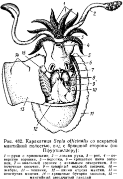 Для замыкания брюшной щели у высших головоногих есть особое приспособление в виде пары полулунных ямок на брюшной стороне туловища, соответственно которым на внутренней поверхности мантии лежат д ва твердых, укрепленных хрящом бугра, или запонки. Между обеими запонковыми ямками на брюшной стороне туловища помещается воронка, мускулистая коническая трубка, приросшая к туловищу. Расширенный задний конец воронки открывается в мантийную полость, суженный передний смотрит наружу. Воронка служит для движения. В мантийной полости на брюшной стороне тела открывается порошица, по бокам её расположены половые и почечные отверстия и ктенидии.
