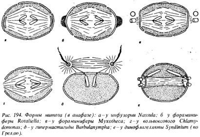 Полуоткрытый ортомитоз .при котором нити веретена проникают внутрь ядра через полярные отверстия в ядерной оболочке, есть у некоторых солнечников и грегарин ,а также у Volvocida и Chloromonada.