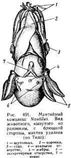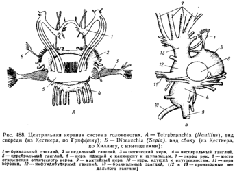 От заднего отдела ганглиозной массы отходят 2 крупных мантийных нерва, которые образуют на внутренней поверхности мантии, по бокам в передней части туловища, 2 больших звездчатых ганглия. У более примитивных Tetrabranchia (Nautilus) центральная нервная система устроена проще; она состоит из 3коротких нервных дуг, одной надглоточной и двух подглоточных, причем по бокам пищевода все дуги соединяются между собой. Дуги усеяны ганглиозными клетками и носят характер нервных тяжей.
