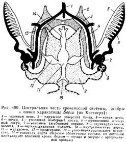 Проходящие в тесном соседстве с почками приносящие жаберные сосуды (с венозной кровью) образуют многочисленные бахромчатые слепые выпячивания (венозные придатки), которыми вдаются в стенки почек, этим облегчается извлечение почками продуктов обмена веществ из крови.