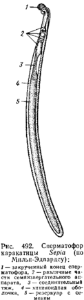 Протоки обладают сложным и варьирующим строением. У самца каракатицы Sepia имеется семяпровод, расширяющийся в семенной пузырёк, железистый эпителий которого служит для образования сперматофоров. За пузырьком семяпровод снова суживается и переходит затем в широкую сперматофорную сумку, которая и открывается сбоку от порошицы половым отверстием. Сперматозоиды головоногих склеиваются в окруженные плотной оболочкой пакеты, или сперматофоры. Сперматофоры наполнены живчиками и имеют особый канал для их выхода, заткнутый сложно устроенной пробочкой.
