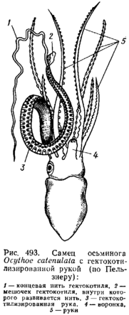 Оплодотворение чаще всего происходит в мантийной полости самки. Роль копулятивного органа играет одно из щупалец, у самцов - оно более или менее сильно отличается от остальных иным развитием присосок и по присутствию на нем специального ложкообразного придатка. При помощи этого щупальца самец вводит сперматофоры в мантийную полость самки.