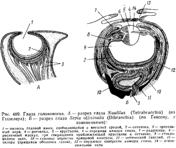 Глаза головоногих обладают аккомодацией, которая совершается, однако, не изменением кривизны хрусталика (как у человека), а его приближением или удалением от сетчатки; для этого служит особый ресничный мускул, прикрепленный к экватору хрусталика. Кроме того, в глазу Cephalopoda имеются приспособления к видению при более сильном и более слабом освещении.