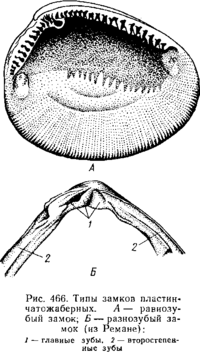 Замком называется соединение створок при помощи зубовидных отростков (зубов) спинного края, входящих в углубления противоположной створки. Различают 2 главных типа замков: равнозубый со значительным числом зубьев одинаковой величины и формы и разнозубый с небольшим числом зубов разной формы; первый тип зубов более древний. У некоторых форм (например, беззубки — Anodonta) замок может отсутствовать, и тогда створки соединены лишь лигаментом.