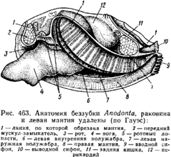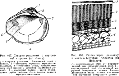 Наружным эпителием мантийных складок выделяются обе створки раковины. Створки прикрывают тело с боков, и у большинства Lamellibranchia развиты одинаково. Однако у некоторых форм они различны главным образом вследствие прирас-тания животного одной стороной к морскому дну. Так, у устриц прикреплена ко дну левая створка; она крупнее другой, более выпукла и вмещает все тело, тогда как правая; створка тонка и функционирует лишь в качестве крышечки. Особенно сильна разница между обеими створками у некоторых ископаемых форм; у рудистов, например, одна из створок имеет вид высокого конуса, а другая, по-видимому, служила крышечкой (Hippurites). Некоторые пластинчатожаберные, например корабельный червь (Teredo), обладают сильно редуцированной раковиной, маленькие створки которой прикрывают лишь 1/20 часть тела. В типичных случаях обе створки выпуклы, причем наиболее выпуклые точки их лежат у спинного края раковины и называются макушками створок. Макушки являются наиболее старыми, начальными частями створок, к которым впоследствии присоединяются по краю все новые слои извести. Соответственно на раковинах можно различать ежегодные слои прироста, идущие параллельно свободному краю раковины и позволяющие определять возраст животного. На спинной стороне тела створки связаны между собой, во-первых, лигаментом, во-вторых, замком. Лигамент состоит из эластического вещества и соединяет обе створки в виде короткой поперечной ленты. Наружный слой лигамента непосредственно переходит в таковой створок, так что раковина, в строгом смысле слова, состоит из одного куска, перетянутого и перегнутого на спине. Вследствие своей эластичности лигамент держит обе створки полуоткрытыми.