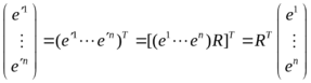 Пусть теперь - дуальный базис к базису , а - дуальный к базису в пространстве . Обозначим через матрицу перехода от базиса к базису в пространстве . Тогда . Чтобы следовать правилу “разных уровней” ( т.е. чтобы индекс суммирования появился сверху и снизу), обозначим через - транспонированная матрица . Тогда . Эту формулу мы запишем следующим образом. Поскольку , то , т.е. . Введём вспомогательную матрицу . Тогда , т.е. . Т .к. базисы дуальны . Т.е. и . Отсюда .
