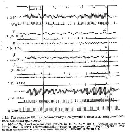 Анализатор имеет набор из 6 полосовых фильтров, в каждом 8 каналов с соответствующими значениями граничных частот: фильтр «δ» — 0,35—4,2 Гц; фильтр «θ» —4,6—7,4 Гц; фильтр «α» —7,7—13,4 Гц; два фильтра диапазона β-волн—«β1 » (низкий) — 13,7—21 Гц и «β2 » (высокий) — 21—30 Гц; фильтр «γ» — 31—70 Гц. Фильтры избирательно выделяют только те колебания ЭЭГ, частоты которых соответствуют полосе пропускания. Выходные сигналы фильтров характеризуют колебания в частотных полосах физиологических ритмов. Ширина полосы пропускания фильтром позволяет осуществлять анализ за короткие отрезки времени. Эпоха анализа сокращается до долей секунды (фильтр имеет небольшое время установления — постоянная времени составляет примерно 0,13 с). Фильтры обладают высокой селективностью.