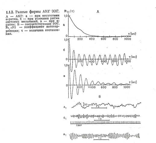 На рис. 1.1.2 в качестве примера разных форм автокоррелограммы (АКГ) приводятся: верхняя АКГ, вычисленная для ЭЭГ затылочной области обследуемого «без α-ритма», средняя — для ЭЭГ затылочной области с отчетливой перестройкой в ритме подаваемых мельканий 12,5 Гц, нижняя — для ЭЭГ затылочной области с хорошо выраженным α-ритмом.