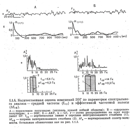На АКГ правой лобной области (зона поражения) выявляется лишь медленная компонента, На АКГ симметричной области «здорового» полушария на фоне медленной составляющей имеются слабо выраженные колебания в α-ритме. На СГ правой лобной области максимальные пики присутствуют в полосе медленных ритмов; СГ левой лобной области характеризуется множественностью пиков с максимумом в α-диапазоне. Вычисленные на ЭВМ величины средней частоты (fcp) и эффективной частотной полосы (∆fэф) позволяют представить данные ЭЭГ в виде упрощенных графиков; ЭЭГ зоны поражения правой лобной области, согласно этим цифровым представлениям, характеризуется смещением fср в сторону медленных ритмов (fcp = 5,6 Гц), а относительно узкая ширина полосы спектра мощности (∆fэф = 6,3 Гц) указывает, что для этой ЭЭГ основная мощность электрических колебаний сосредоточена в низкочастотной области вблизи fср. Совсем иная картина характерна для ЭЭГ симметричной очагу области — левой лобной: fcp = 14 Гц, т. е. расположена близко к верхней границе α-диапазона при эффективной полосе спектра — ∆fэф = 11,2 Гц. Последнее обстоятельство свидетельствует о том, что в ЭЭГ лобной области «здорового» полушария присутствует довольно широкий набор частот колебаний.