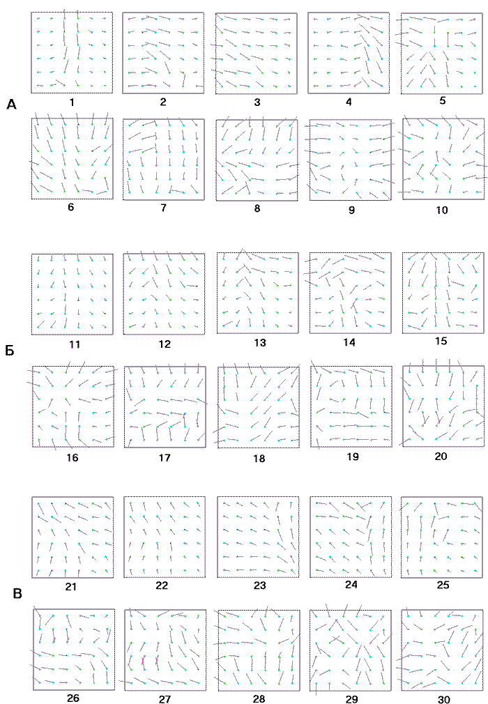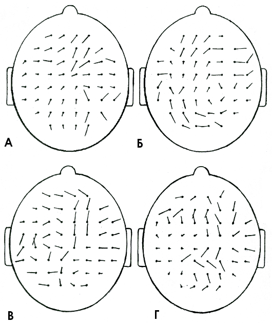 Многими авторами ранее отмечалось существование нескольких "генерирующих областей", взаимоотношения между которыми достаточно динамичны, и граница между ними испытывает постоянные смещения даже во время одного интервала однородности фазовых соотношений. Правда во всей коре таких областей раньше насчитывали, по одним данным, две, по другим - три [26, 32, 33, 43]. Отмечены также изменения формы и фазовых соотношений "движущихся" волн на границе цитоархитектонических полей - имело место отклонение от прямолинейного движения [38]. По нашим предварительным данным, полученным тем же методом визуализации для всей коры, таких областей может быть гораздо больше - см. например, рис.4В, Г. На рис.4 приведены векторные структуры, рассчитанные на основе традиционной системы "10-20" (число электродов 21), причём отобраны достаточно простые ва-рианты из наблюдавшихся.