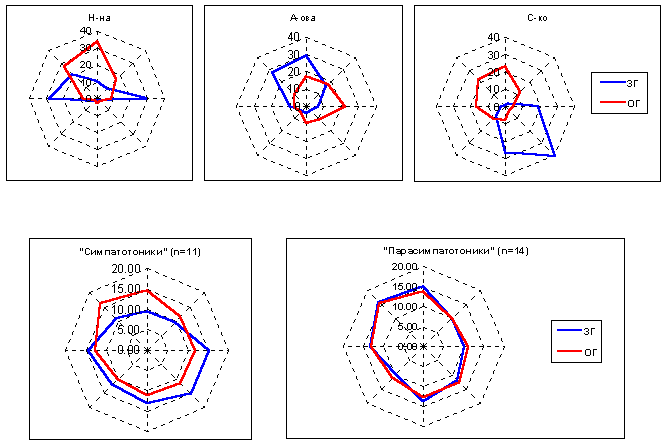 В отношении межуровневых взаимосвязей обнаружилось следующее. Те лица, для ко-торых отмечалась наиболее резкая динамика траектории и скорости ЭЭГ-волны при откры-вании глаз (рис.5Г), характеризовались высокой эмоциональностью психомоторики по оп-роснику ОСТ В.М.Русалова, т.е. склонностью к выразительным мимическим движениям и жестикуляции. Эти же люди отличались низким парасимпатическим тонусом по показателям вариативности R-R-интервалов, т.е. являлись симпатотониками - см. [2, 20]. Для людей, об-наруживших при нагрузке низкую динамику ЭЭГ-показателей (рис.5Д), отмечался противо-положный комплекс - неритмичный пульс, т.е. высокий парасимпатический тонус, и низкая эмоциональность психомоторики. Эти люди отличались также и внешне. Для первого типа в его предельном выражении характерно следующее: румянец, громкий звонкий голос, широко открытые глаза, резкость в движениях, мышечный тип телосложения, решительность. Испы-туемые второго типа в пределе обнаруживают противоположный симптомокомплекс: блед-ность, худоба, прикрытые глаза, тихая речь, плавные медленные движения, осторожность.