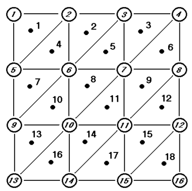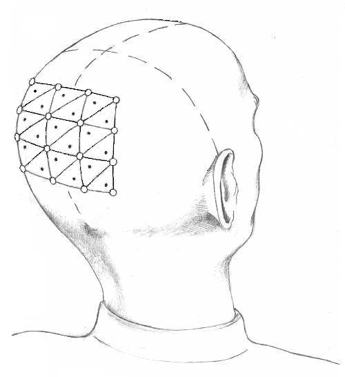 Всё квадратное поле из 16 электродов было разбито на 18 треугольных сегментов, как показано на рис.1Б. В качестве опорной точки в каждом треугольном сегменте служила вершина прямого угла; относительно этого пункта в отсчётах АЦП измерялись отставания (или опережения) колебаний в двух других пунктах - через отыскание максимума соответствующей кросскорреляционной функции. По получившимся двум ортогональным сдвигам (катеты прямоугольного треугольника) строился вектор, характеризующий, по нашей идее, направление "бегущей волны" ЭЭГ в пределах данного треугольного сегмента. Таким образом, каждый сегмент анализировался отдельно и в каждом случае сопоставлялись ЭЭГ двух соседних пунктов, которые при межэлектродном расстоянии 2 см были с гарантией высоко когерентными и потому сопоставимыми. Суммарная картина из 18-и векторов получается целостной и упорядоченной в той мере, в какой упорядочена реальная "единая движущаяся волна ЭЭГ" (см. рис.2). Однако при такой схеме все измеряемые временные сдвиги заведомо малы и требуют для своего измерения высокой частоты дискретизации.