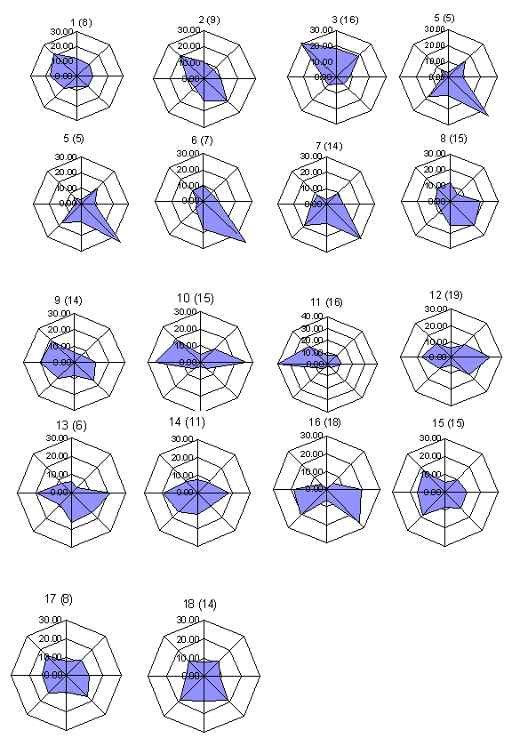 Однако сами эти отдельные измерения, будучи независимыми оценками, также представляют ценность. Они необходимы для независимого анализа фазовых соотношений методами вариационной статистики и объективного контроля выявляемых визуально закономерностей, о чём говорилось во Введении. Такой анализ был нами призведён. Для каждого испытуемого вычислялась доля векторов каждого направления из 8-и выделенных направлений - два продольных (вперёд и назад по голове), два поперечных (вправо и влево) и 4 диагональных. Если очередной вектор попадал в пределы соответствующего сектора пространства (см. рис.1,В), то счётчик данного направления увеличивался на единицу. Затем доля каждого направления вычислялась в процентах от общего числа эпох анализа. Для каждого направления велась также отдельная статистика длин векторов, или - по нашей модели - наблюдающиеся скорости распространения волны в данном направлении. Описанные статистические параметры накапливались раздельно по каждому из 18-треугольных сегментов (сегменты - см. рис.1,Б), а также вычислялись и усреднённые параметры по всему электродному полю. По индивидуальным данным строились лепестковые диаграммы (рис.3).