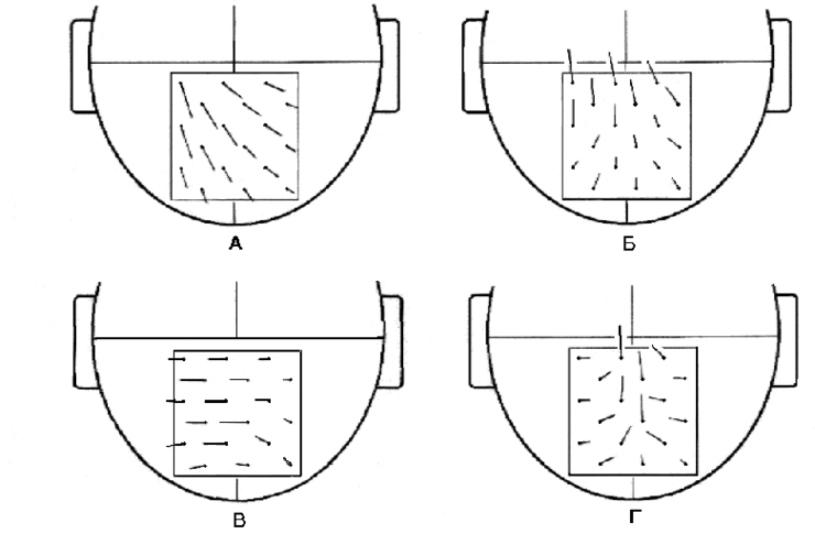 Рис.2. Примеры векторных структур "бегущей волны" ЭЭГ. А - диагональный перелив, более свойственный интровертам; Б -диагональный перелив, более свойственный экстравертам; В - поперечный перелив; Г - перелив по сложной траектории.